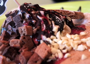 色々なトッピングがのっているパンケーキ。とっても魅力的だけれど。