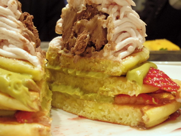パンケーキの間にはイチゴ、ピスタチオクリームが