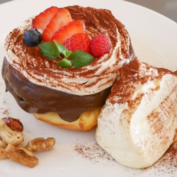 まるでいちごのホールケーキみたい!?たっぷりのチョコレートクリームといちごの組み合わせが素晴らしい♪生地のしっとり感とクリームがマッチ☆!クリスマス限定パンケーキ、登場なんだぜ~♪木と水と土とhttp://www.ki-mizu-tsuchi.com/昨日はティラミスパンケーキをご紹