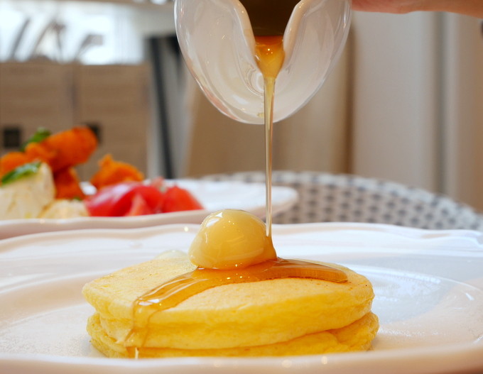 たくさんかけると生地にじゅわりと染み込んでいきしっとりパンケーキに♡