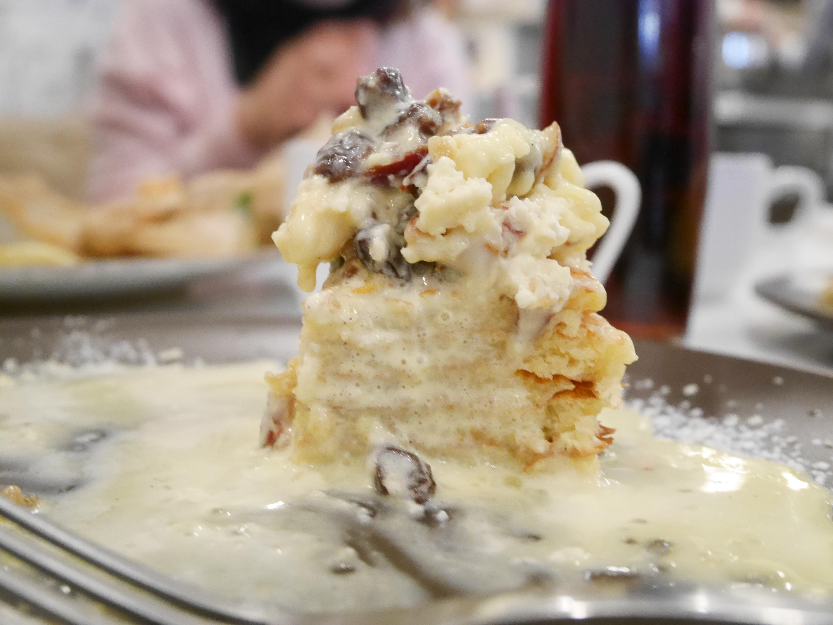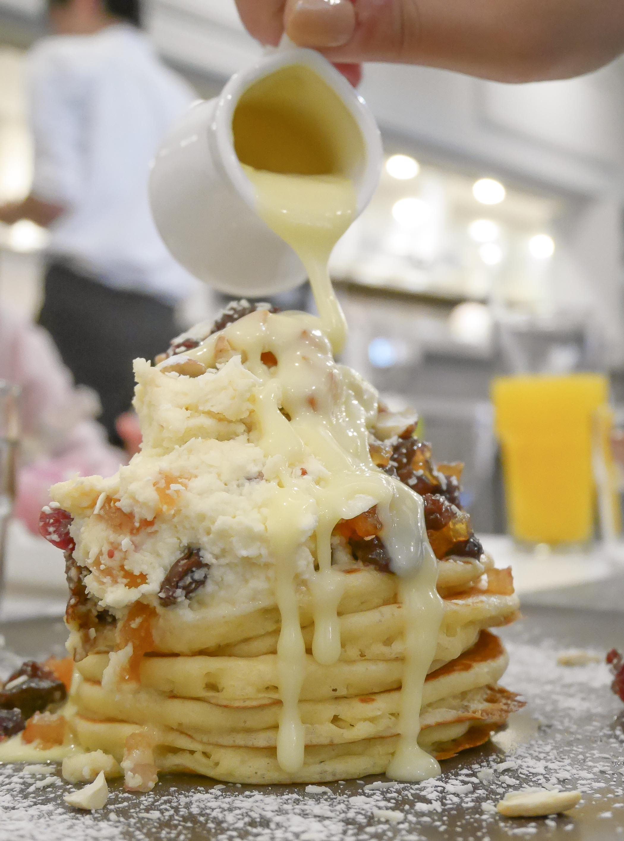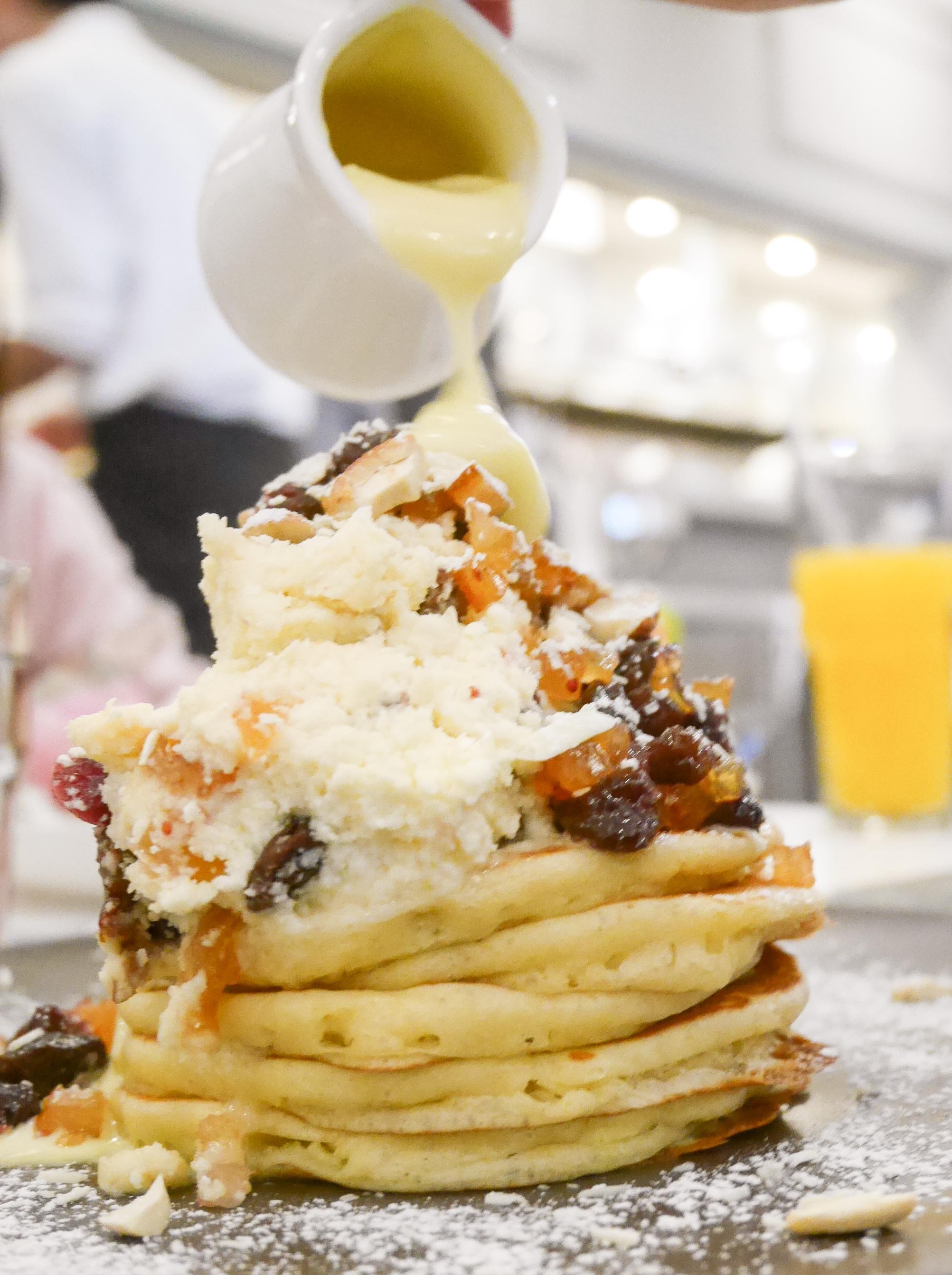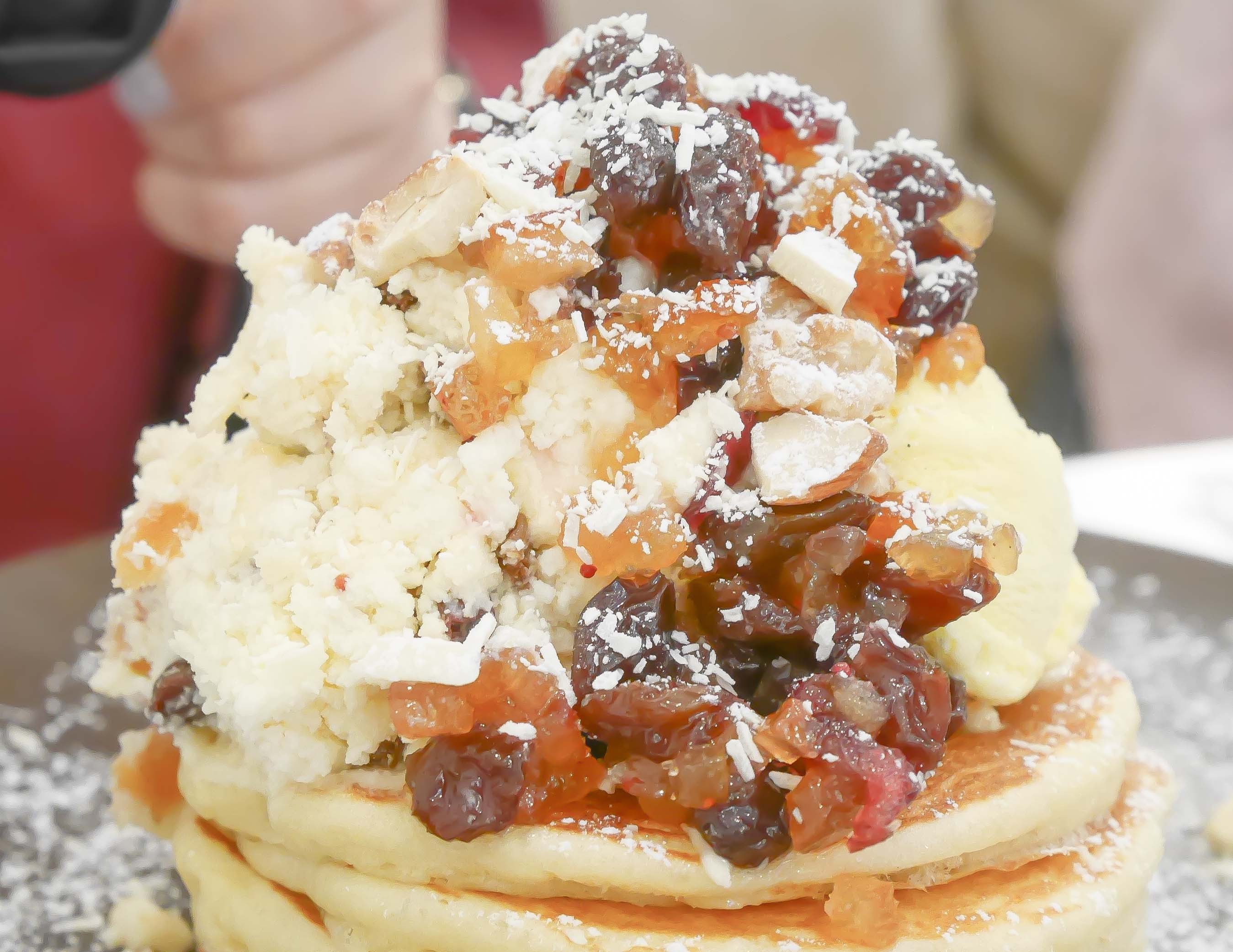 ドライフルーツ特有の食感がパンケーキと合わさるのが斬新で、
