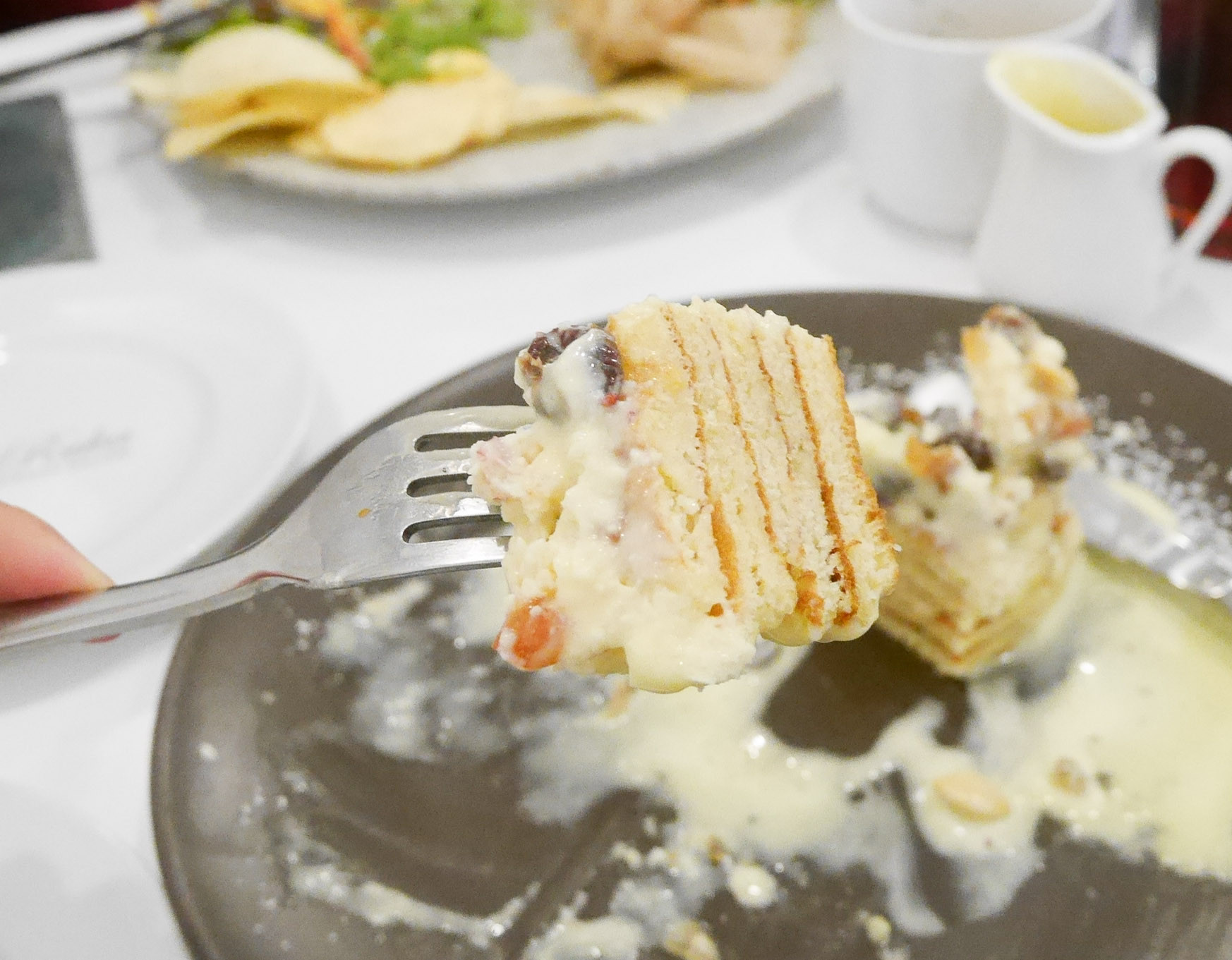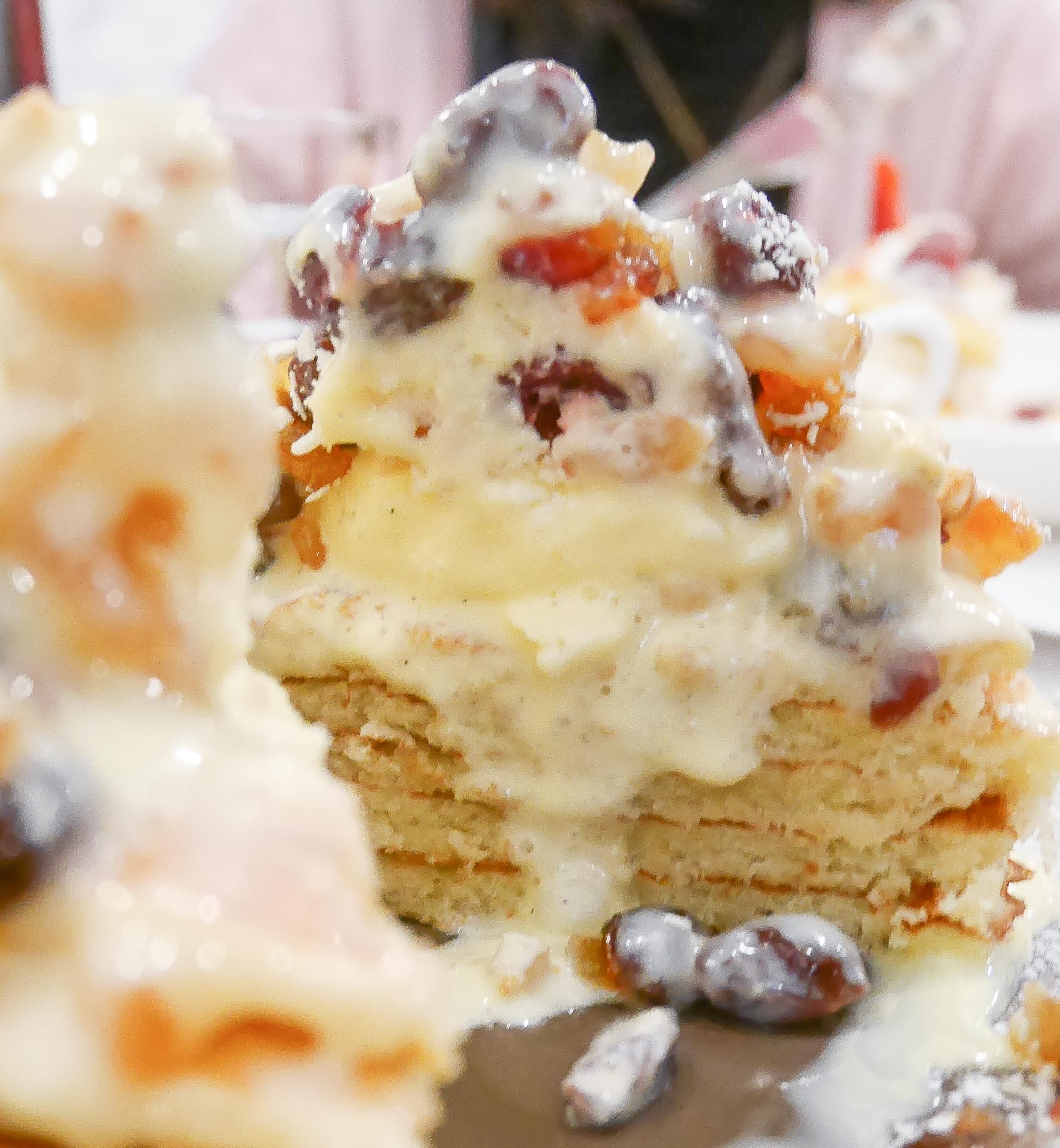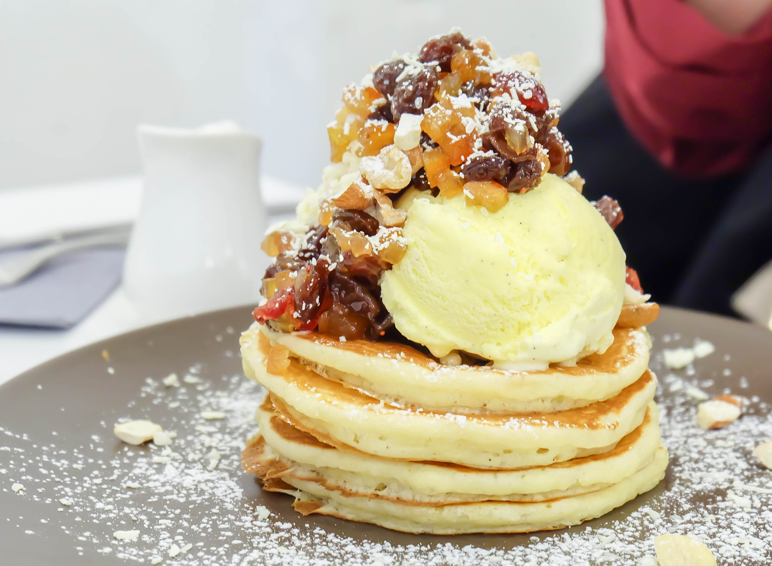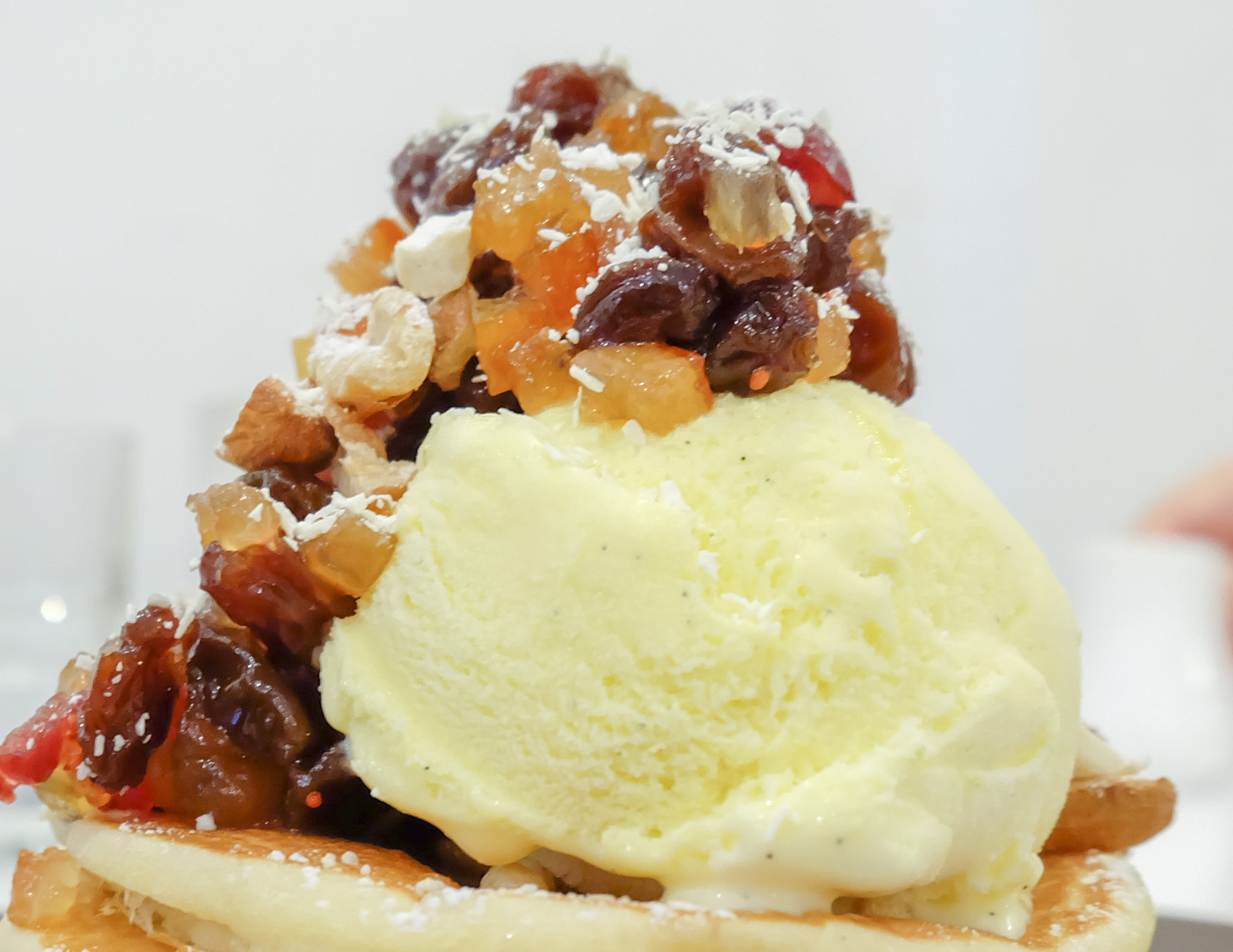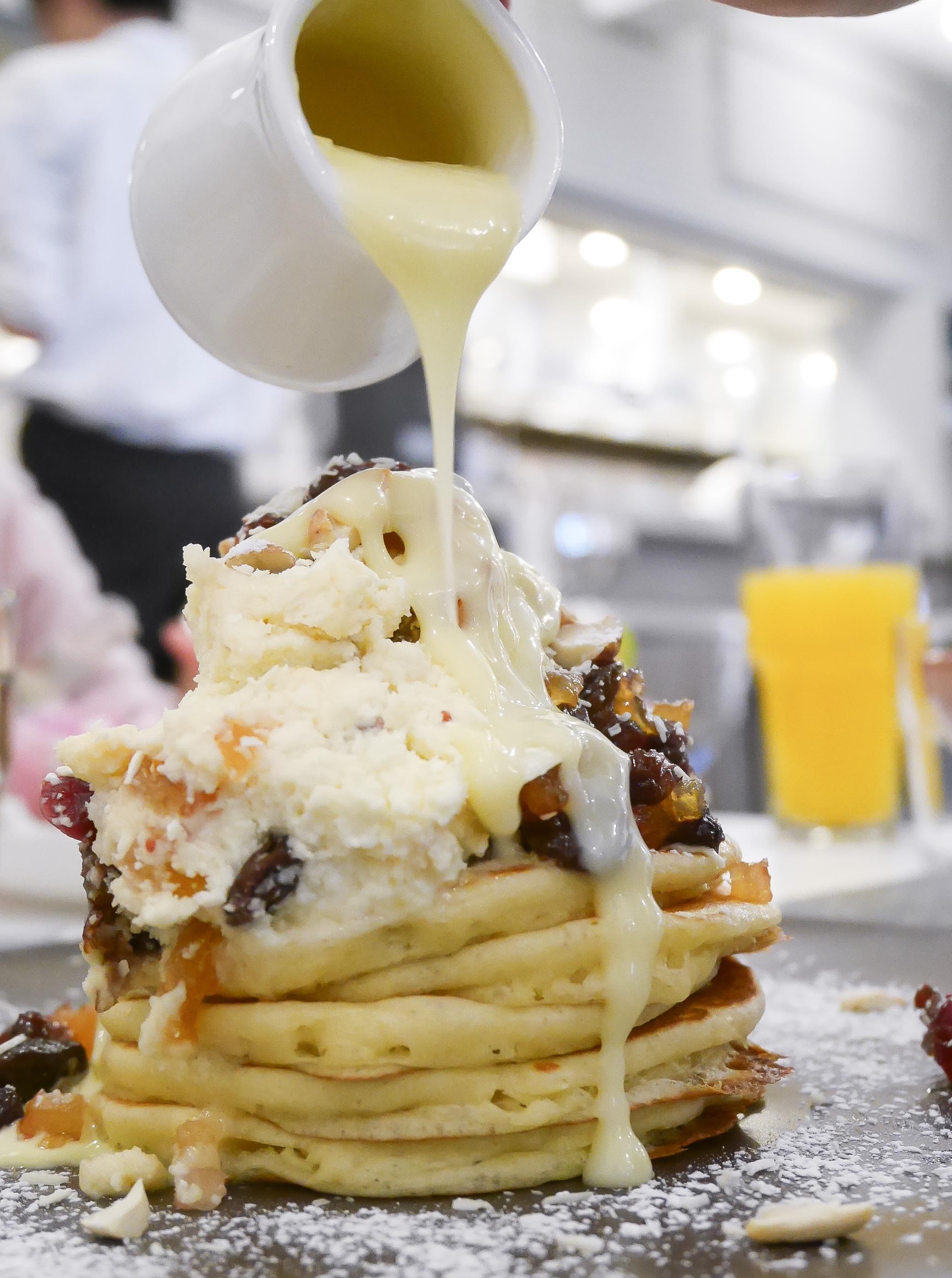 ドライフルーツ特有の食感がパンケーキと合わさるのが斬新で、