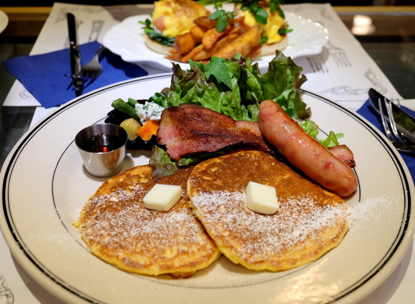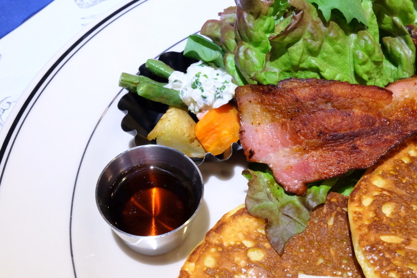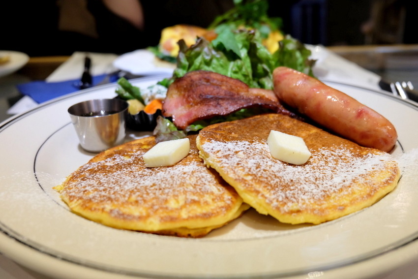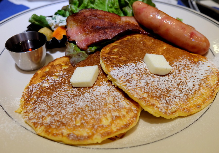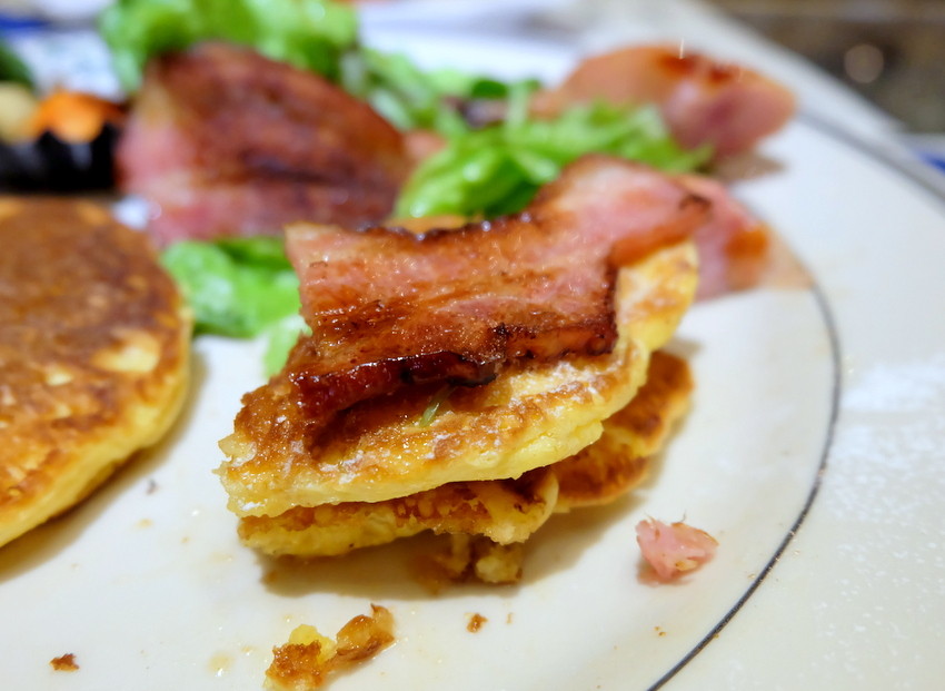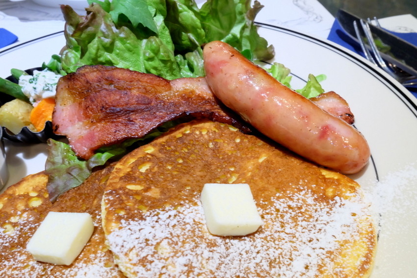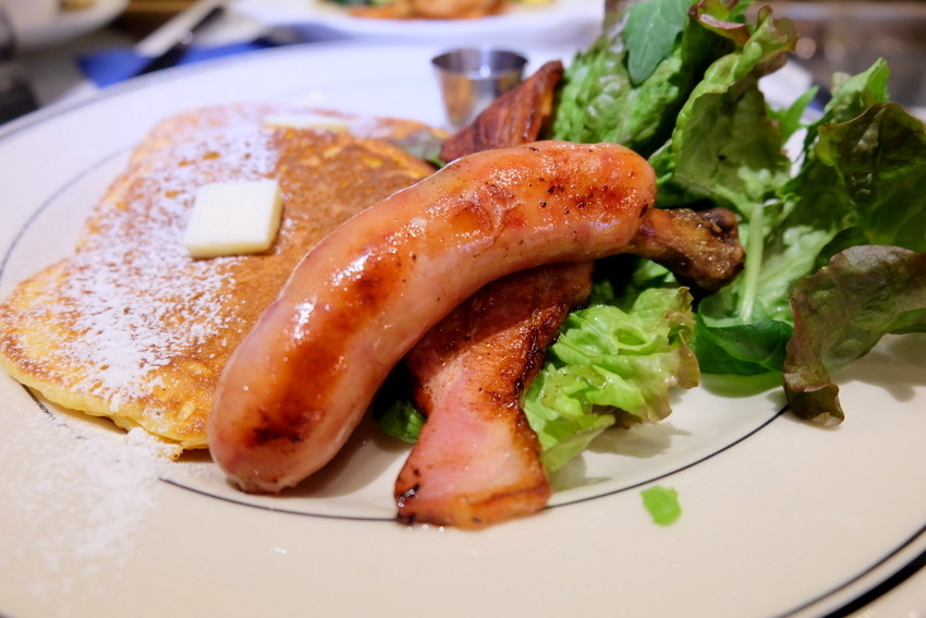パンケーキとともに頂くベーコンと骨付きソーセージ