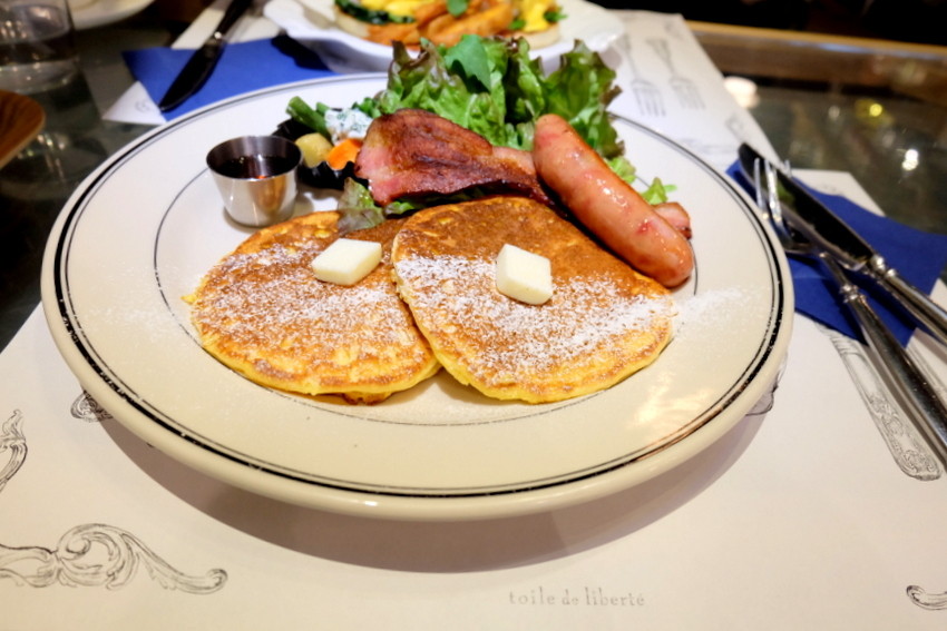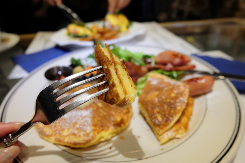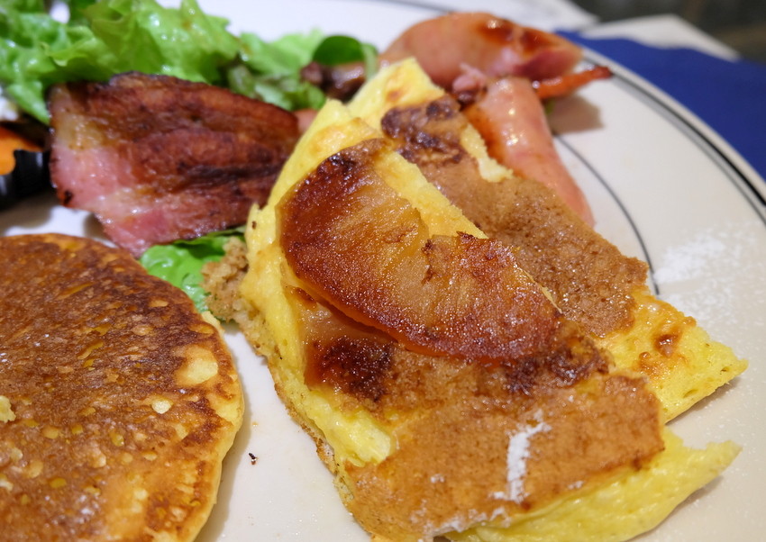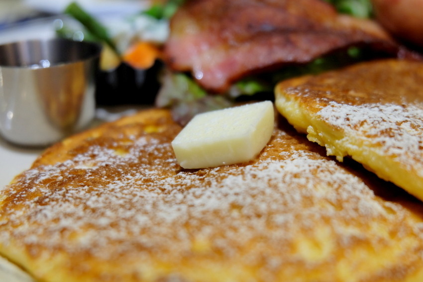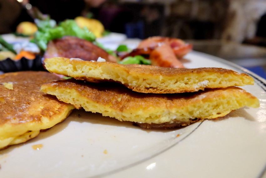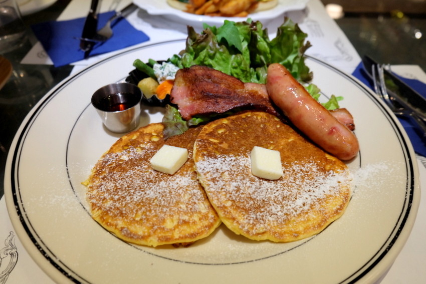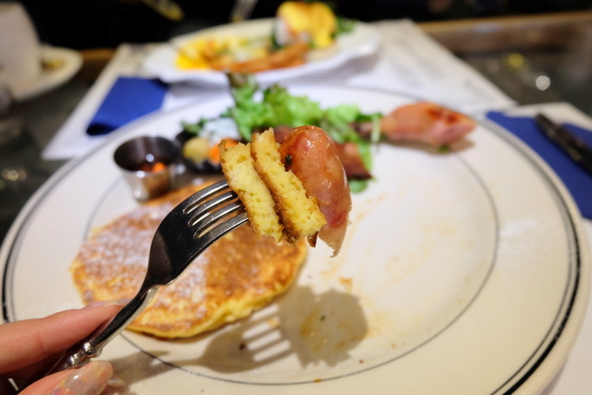 パンケーキとともに頂くベーコンと骨付きソーセージ