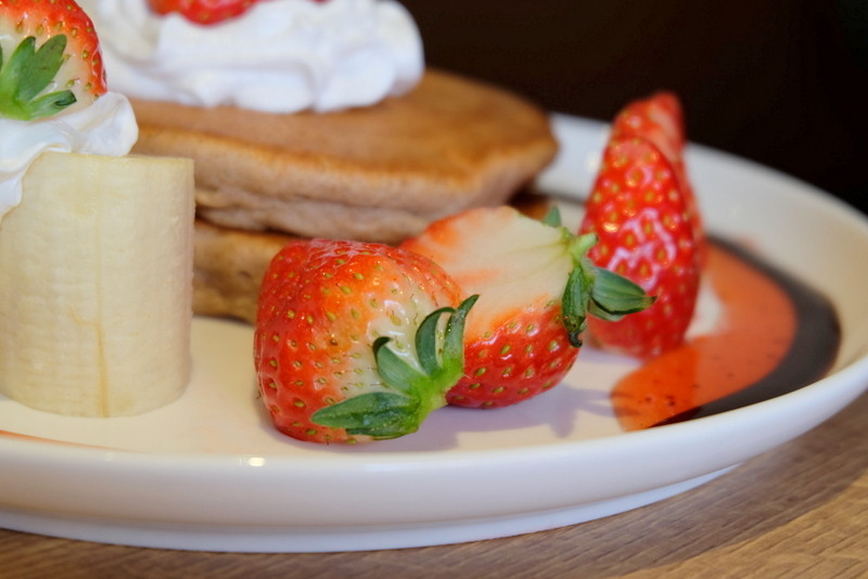 いちごの赤が良く映えるパンケーキ、キター!!