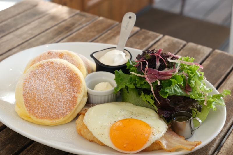 パンケーキと、鎌倉野菜、ベーコン、ハッシュドポテト、目玉焼き