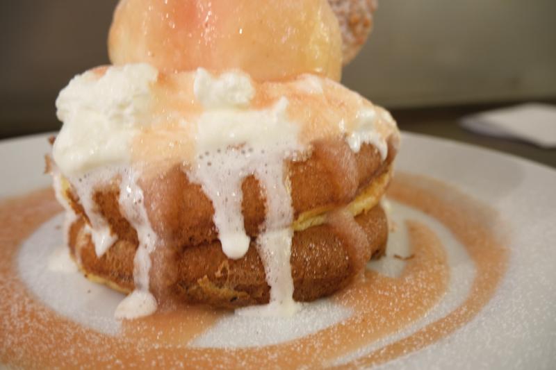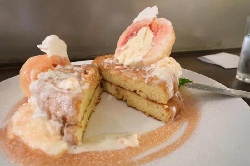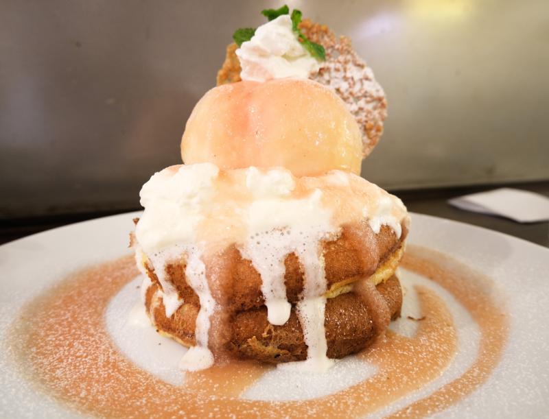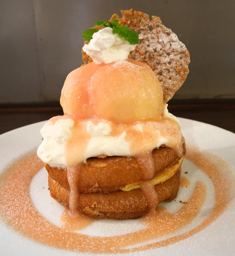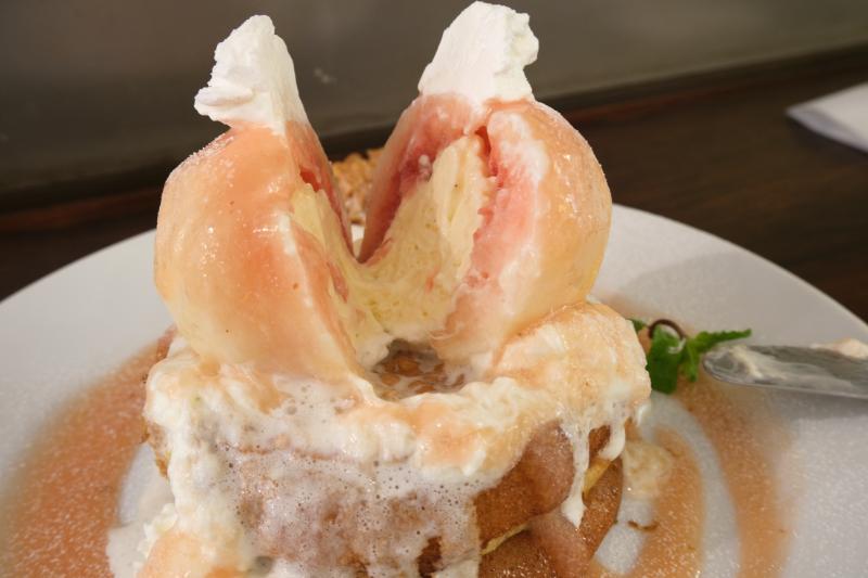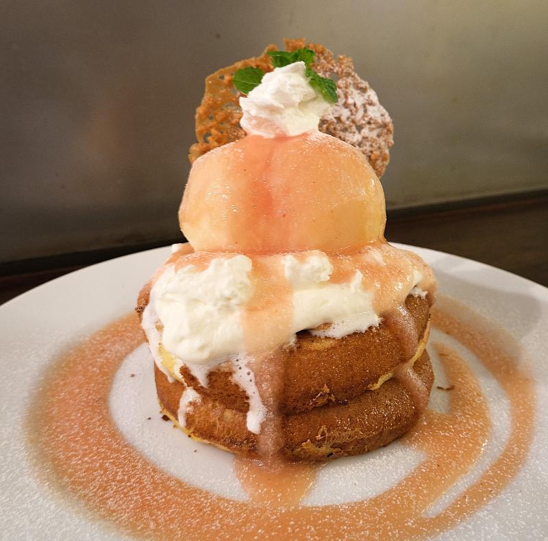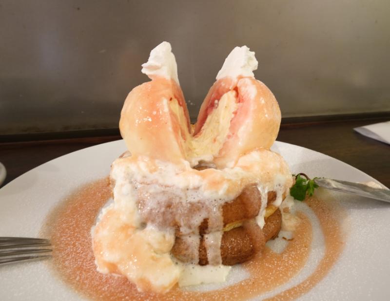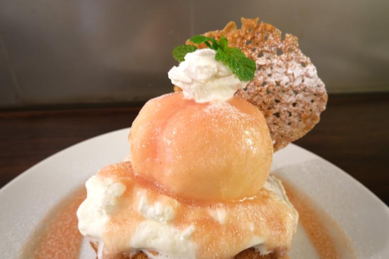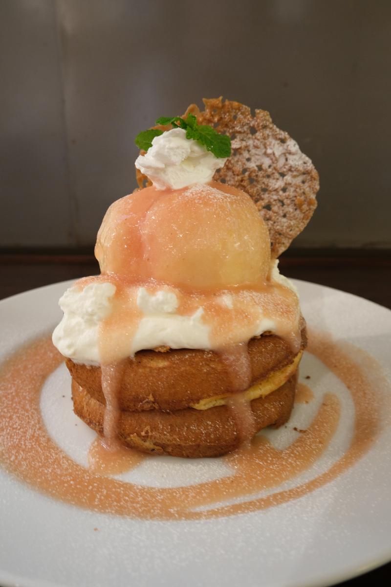 丸ごと桃が乗った豪快パンケーキ!